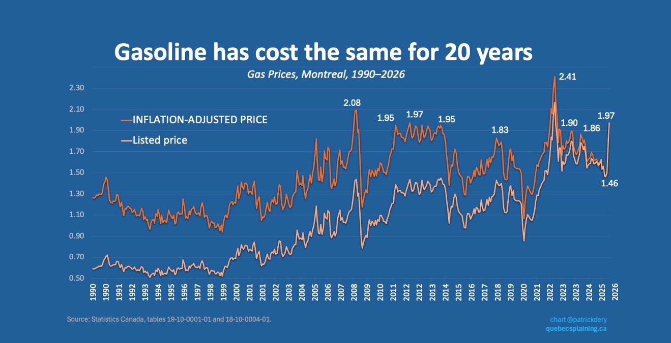 Below is the price of gas in Montreal since 1990. It’s similar for the rest of Quebec unless you live in Kuujjuaq. The lighter line is the price posted at the gas station. The darker line shows the price adjusted for inflation. Or, in other words, the price a litre of gas would have cost five, ten, or fifteen years ago, if money had the same value then as it does today.