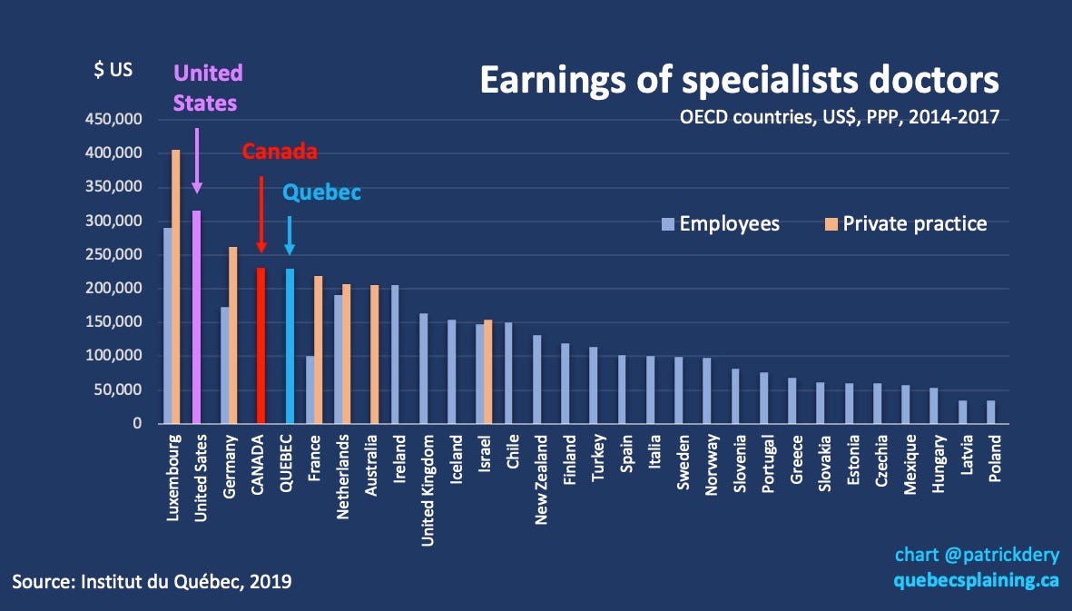 Furthermore, in Quebec (and Canada), doctors can incorporate their practices. This allows them to pay taxes at the much lower corporate rate.