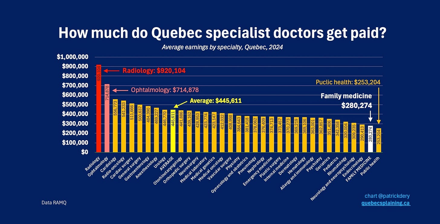 As previously mentioned, a typical specialist doctor in Quebec earned $446,000 in 2024.