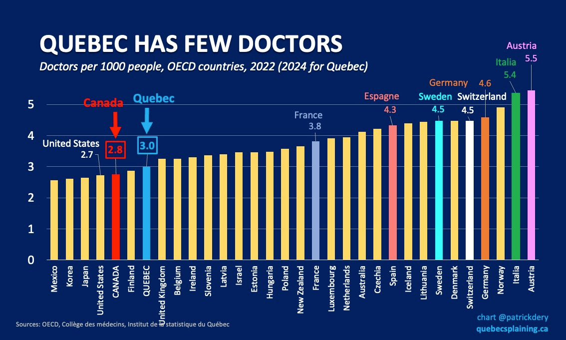 Quebec and Canada have chosen to have few doctors, but to pay them more than almost anywhere in the world. And Quebec and Canada remain among the places in the developed world with the fewest doctors per capita.