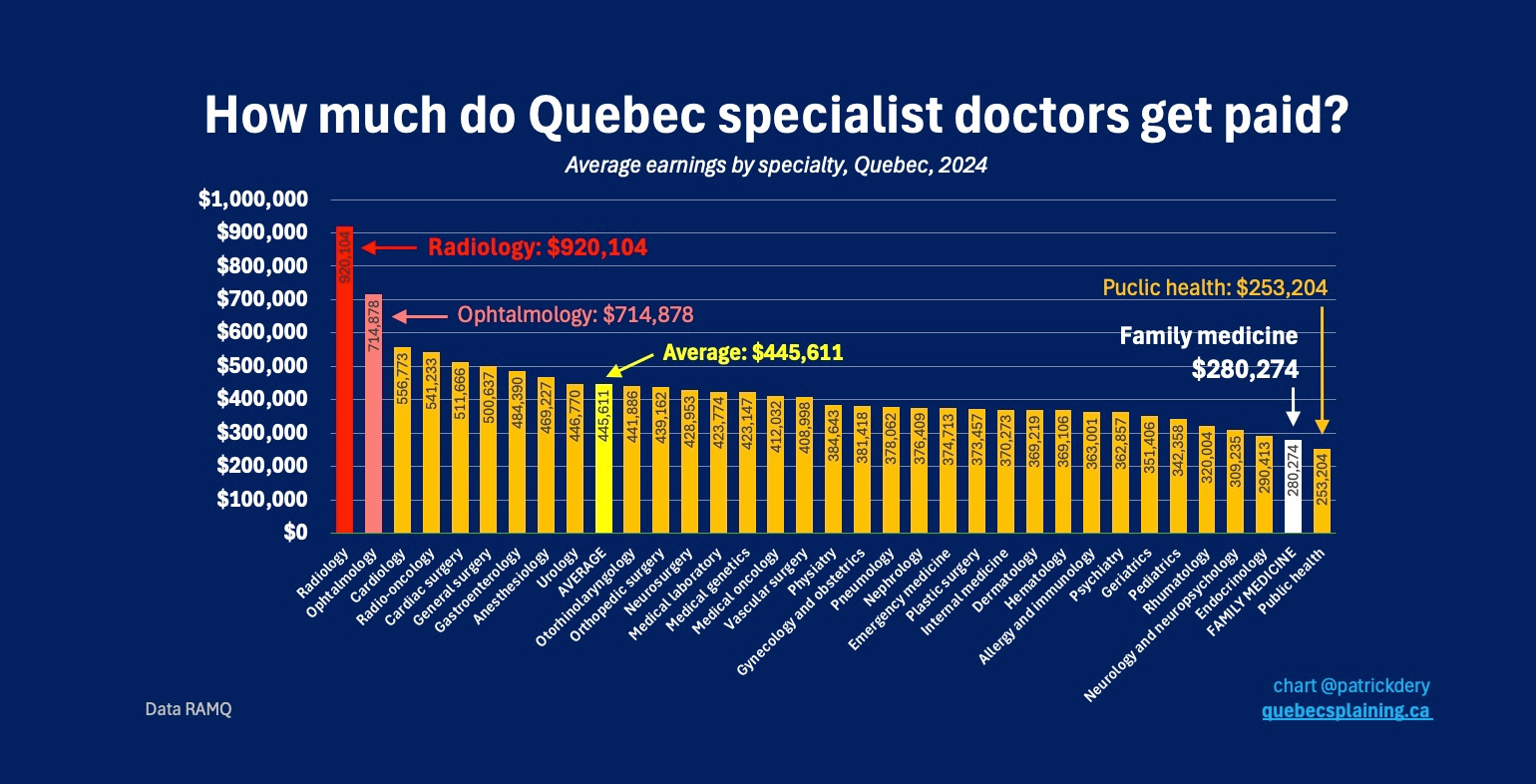 In 2024, in Quebec, specialist doctors received an average of $445,611, again according to RAMQ data. That’s not even for working full-time. According to a recent HEC study, the average full-time equivalent remuneration for a Quebec specialist doctor was $548,000 (in 2022).