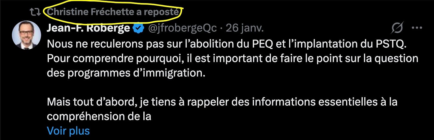 At the end of January, as a prelude, Fréchette relayed on X a statement by Jean-François Roberge, who is adamant about abolishing the QEP.